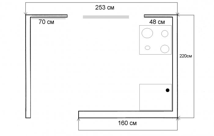 Итого, 2,4 м на бытовую технику с мойкой. Попробуем вписать это в наше пространство. Верхние шкафы можно размещать как вашей душе угодно, главное помнить о том, что над мойкой лучше поместить сушилку для посуды, а над плитой вытяжку.