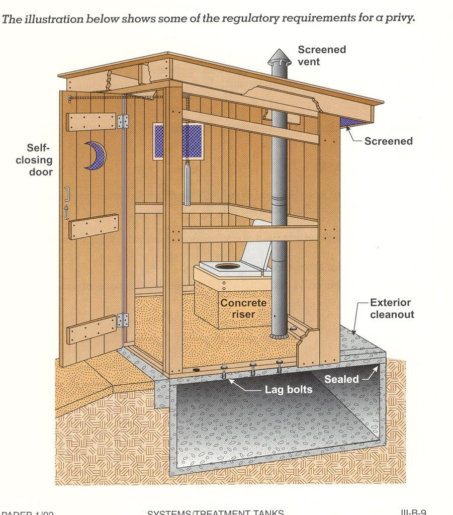 Туалеты с выгребной ямой устраивают в удалении от домов, источников водоснабжения и границ соседних участков