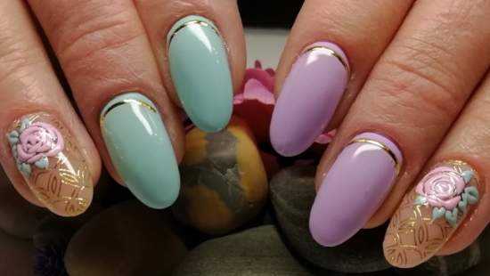 Выбирая модный и красивый маникюр с литьем на короткие ногти, лучше сделать такой дизайн на одном ногте и смещать положение декора ближе к кончику.