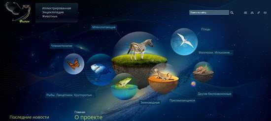 Сайт в виде энциклопедии про животных с красочными картинками.