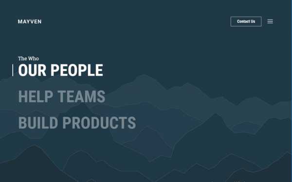 Mayven Dev – креативная команда 30 кодеров / UX-дизайнеров из Сан-Франциско. Их сайт отличают сдержанная эстетика оформления, индивидуальность стиля, приятные цветовые решения с выразительными контрастами белой типографики и анимированной контурной графики на изумрудном фоне.