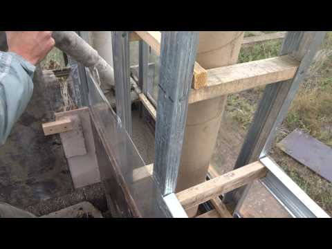 Шлакобетон засыпают в опалубку послойно с толщиной каждого слоя 200 мм. Каждую насыпку трамбуют, тщательно распределяя материал по углам и периметру опалубки в местах сопряжения стен. По мере застывания очередного слоя смеси опалубку передвигают вверх.
