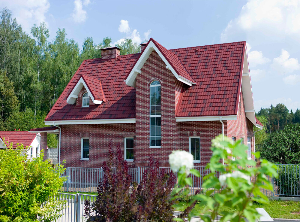 Зачастую этот цвет крыши выбирают сдержанные люди, ведь коричневый вызывает у них ощущение полной защиты, уюта и комфорта. Данный цвет является одним из самых популярных, так как он прекрасно сочетается с окружающим ландшафтным дизайном, создает единую живописную картину. Особенно выгодным внешне вариант будет смотреться в случае, если дом располагается за чертой города. - Красно-бордовый – цвет уверенных в себе и целеустремленных людей. Красный всегда считался достаточно агрессивным цветом, но это не совсем верно, ведь он заряжает энергией, пробуждает желание к действию. Такой цвет психологи рекомендуют людям, связанным с бизнесом или прочей активной деятельностью. Особенно хорошо выглядит красная крыша с фасадом белого или черного цвета, играя с ним на контрасте.