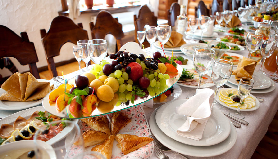 Основные блюда расставляются в середине стола. Можно сразу поставить холодные закуски и горячее. Если обед торжественный, тогда сначала подается аперитив и закуски, потом – коронное блюдо хозяйки.