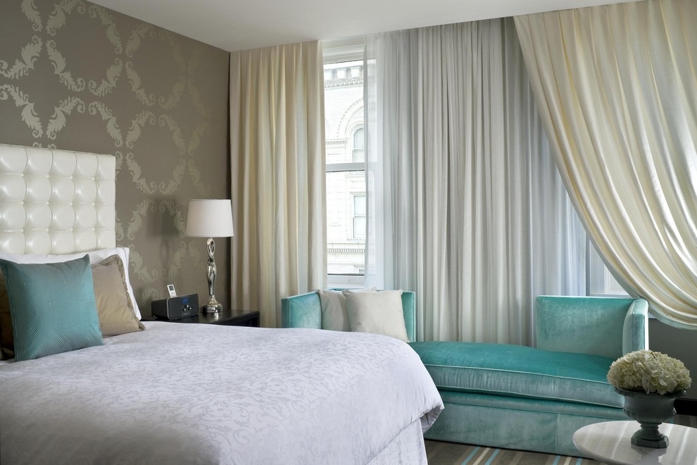Длинные шторы, складками ниспадающие на пол, придают спальне элегантности. Чтобы добиться такого эффекта обычно занавески делают на 5-15 см длиннее, чем высота до уровня пола.