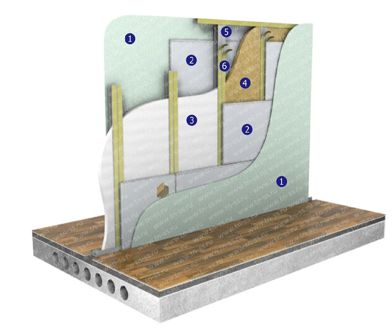 В таком случае все поверхности первой «коробки» с несущими, например, железобетонами стенами и перекрытиями облицовываются конструкциями дополнительной звукоизоляции стен, пола и потолка.