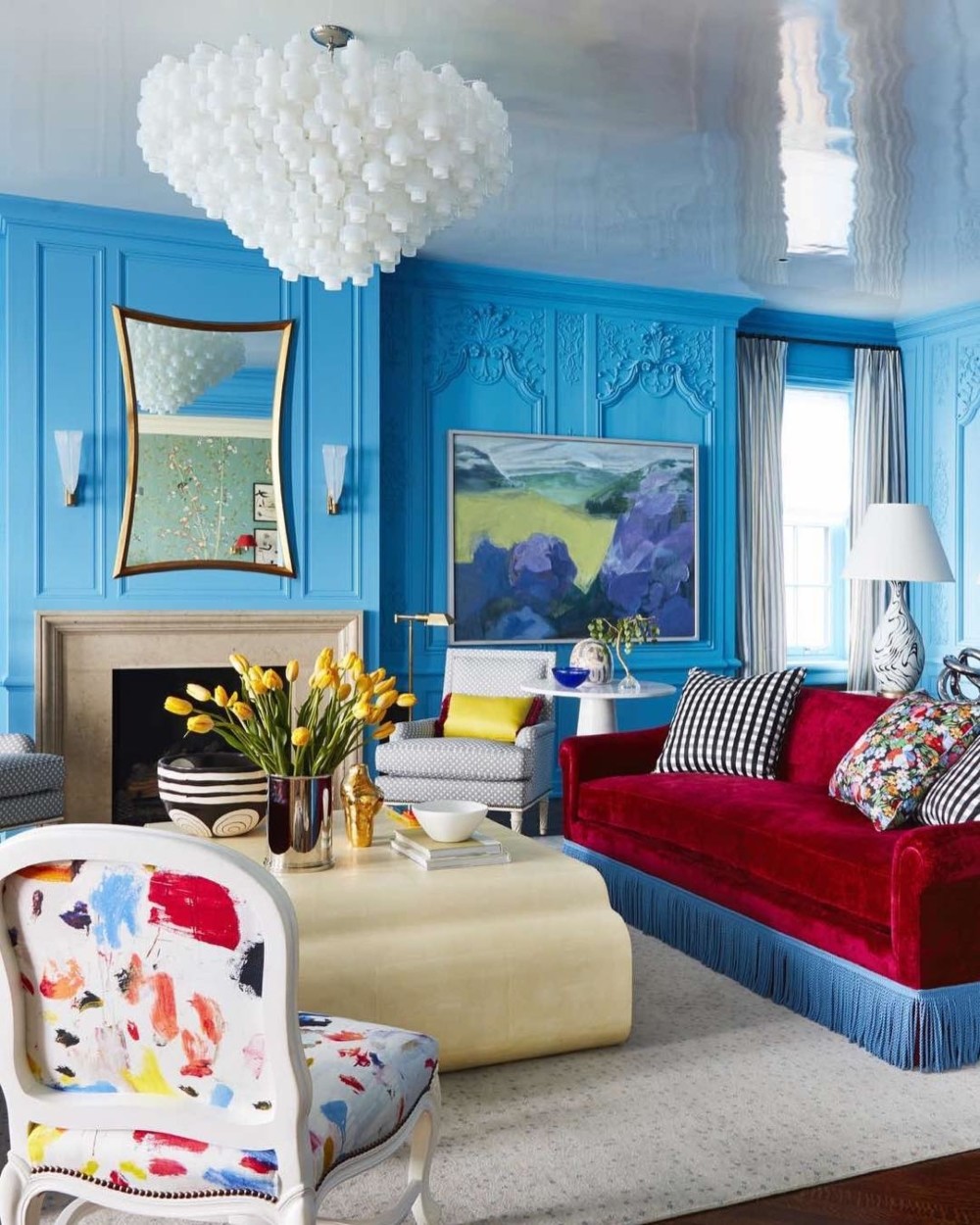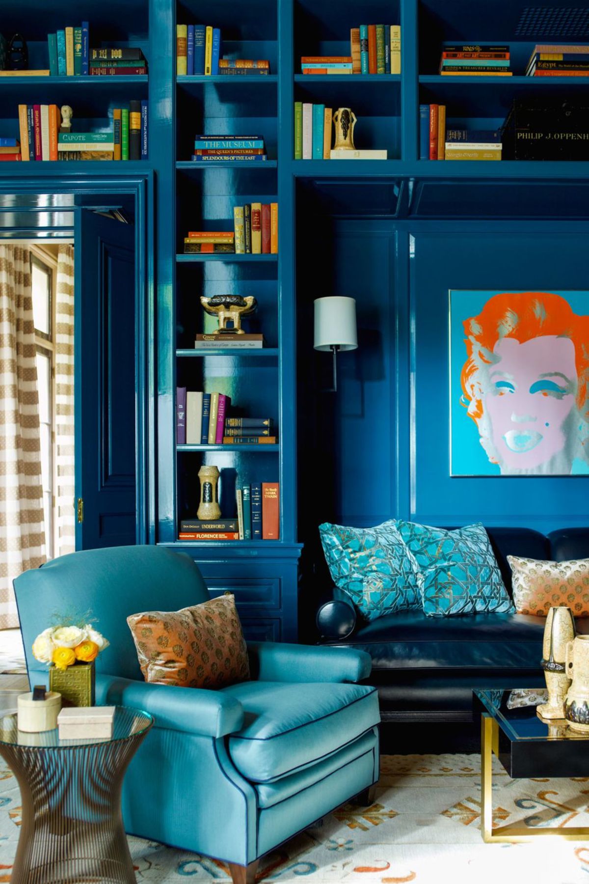 Синий — безопасный цвет, особенно для покрытия необычных архитектурных форм. В то время как пышные стены могут показаться слишком современными, синие стены кажутся непринужденными и дружелюбными.