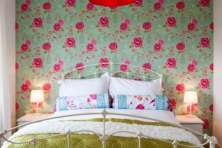 Обои в мягкой палитре розовых, голубых, зеленых, желтых, бежевых и лавандовых оттенков — идеальное решение для романтической спальни.