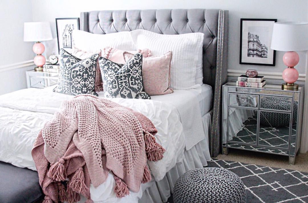 Идеальное сочетание розового и серого для спальни, особенно если вы решите внести серый цвет с помощью аксессуаров.