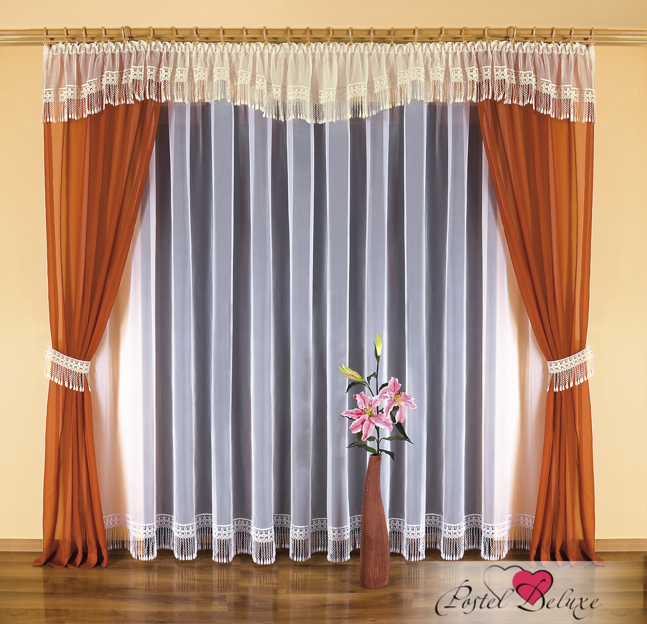 Для сложных портьер, составленных из нескольких элементов: ламбрекена, галстуков, свагов, лучше подобрать белый или пастельных тонов простой тюль из гладкого плотного натурального шелка с небольшим добавлением синтетических волокон.