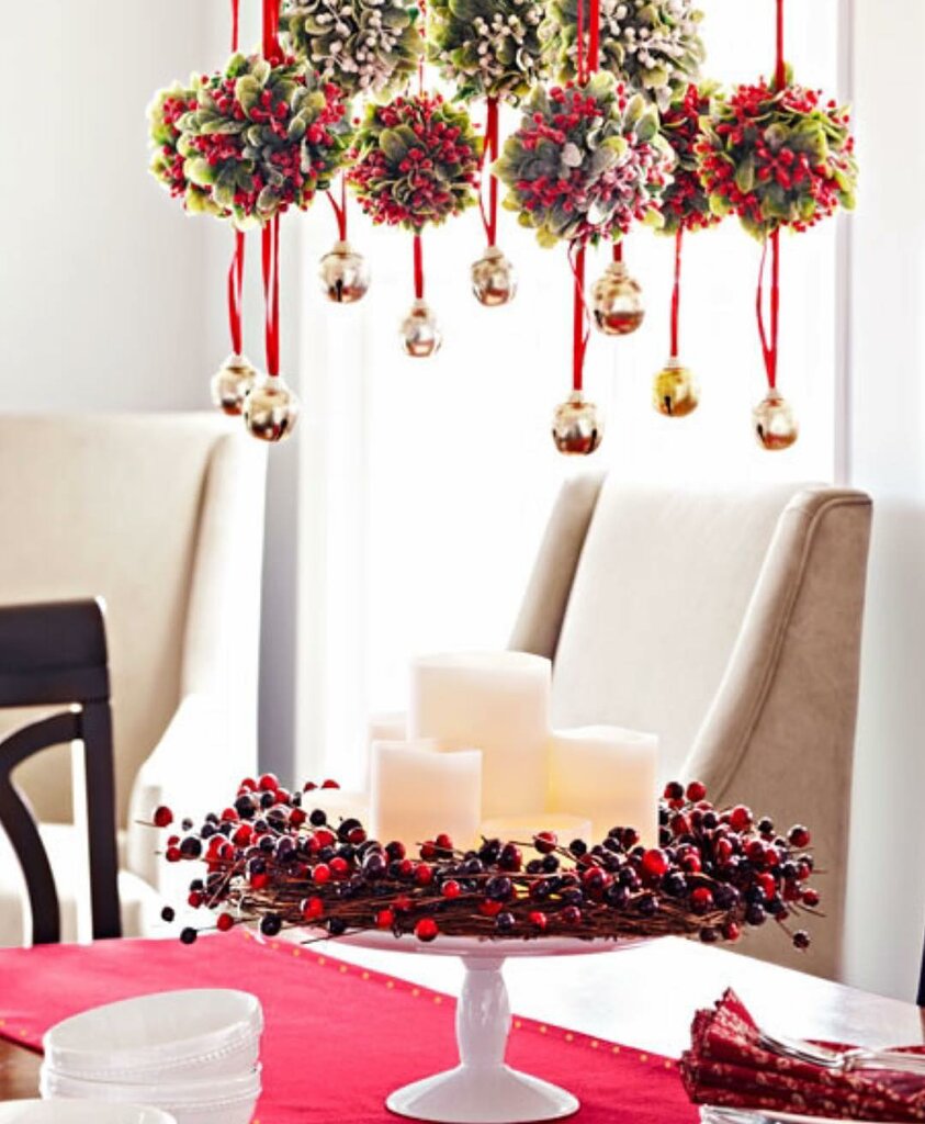 Новогодний стол можно украсить красивой композицией из хвойных веток и гроздей калины или рябины. Главным элементом новогоднего декора стола может стать подвесная зимняя композиция.