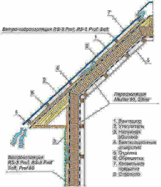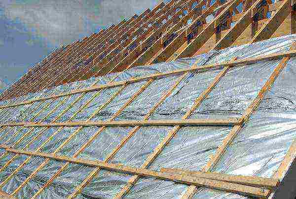 Популярный вариант утепления – размещение минеральной ваты между стропильных ног. Кровельный пирог обязательно дополняется пароизоляционной пленкой и диффузионной мембраной.
