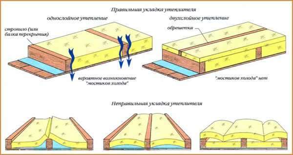- С внутренней стороны стропильной системы уложить утеплитель. Теплоизоляция размещается в два слоя толщиной по 100 мм, схема монтажа – шахматная раскладка.