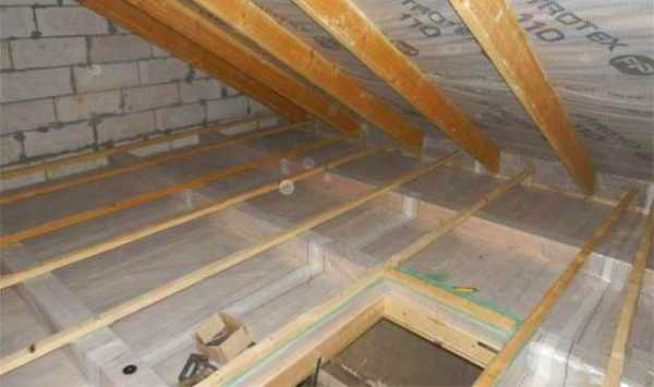 Работу начинают с того, что к нижней части потолочных балок системы перекрытия по всей длине сбоку набивают специально заготовленные черепные бруски. Для этой цели отлично подойдут обычные деревянные рейки, сечение которых составляет 30х50 мм. Они необходимы для установки щитов наката. Под ними подразумевают листы гипсокартона, фанеры, прочих материалов или доски, которые смогут удерживать вес утеплителя.