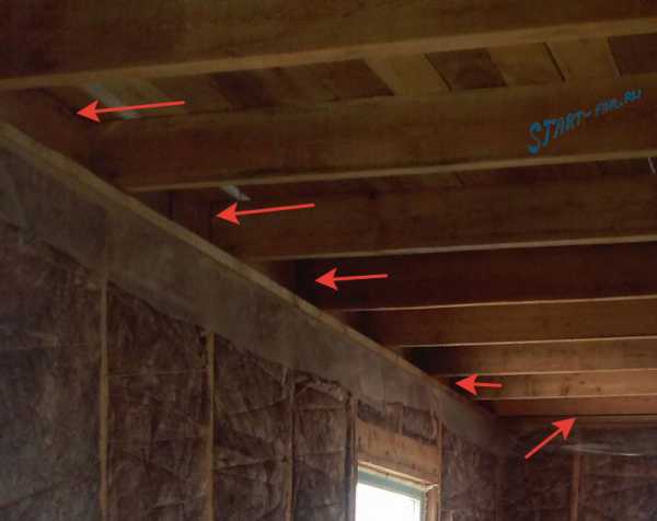Балки перекрытий имеют двойную функцию. С одной стороны на них крепят потолок из гипсокартона, с другой – набивают лаги пола. Толщина досок для пола должна составлять не менее 1/20 от длины. Например, для пролета 4 м потребуется лага толщиной от 20 см. Пространство перекрытия заполняют утеплителем.
