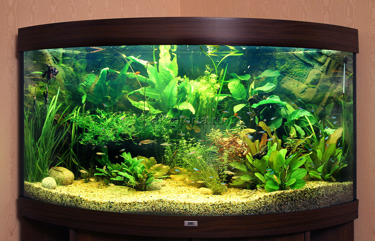 Стоит отметить и форму аквариума: необязательно она прямоугольная. Есть и цилиндрические конфигурации. Обратите внимание на подставку: она должна быть прочной, т. к. масса воды иногда превышает 0,5 тонны. Оригинально смотрится изделие, выполненное в виде напольных часов. Плюсы напольного аквариума: