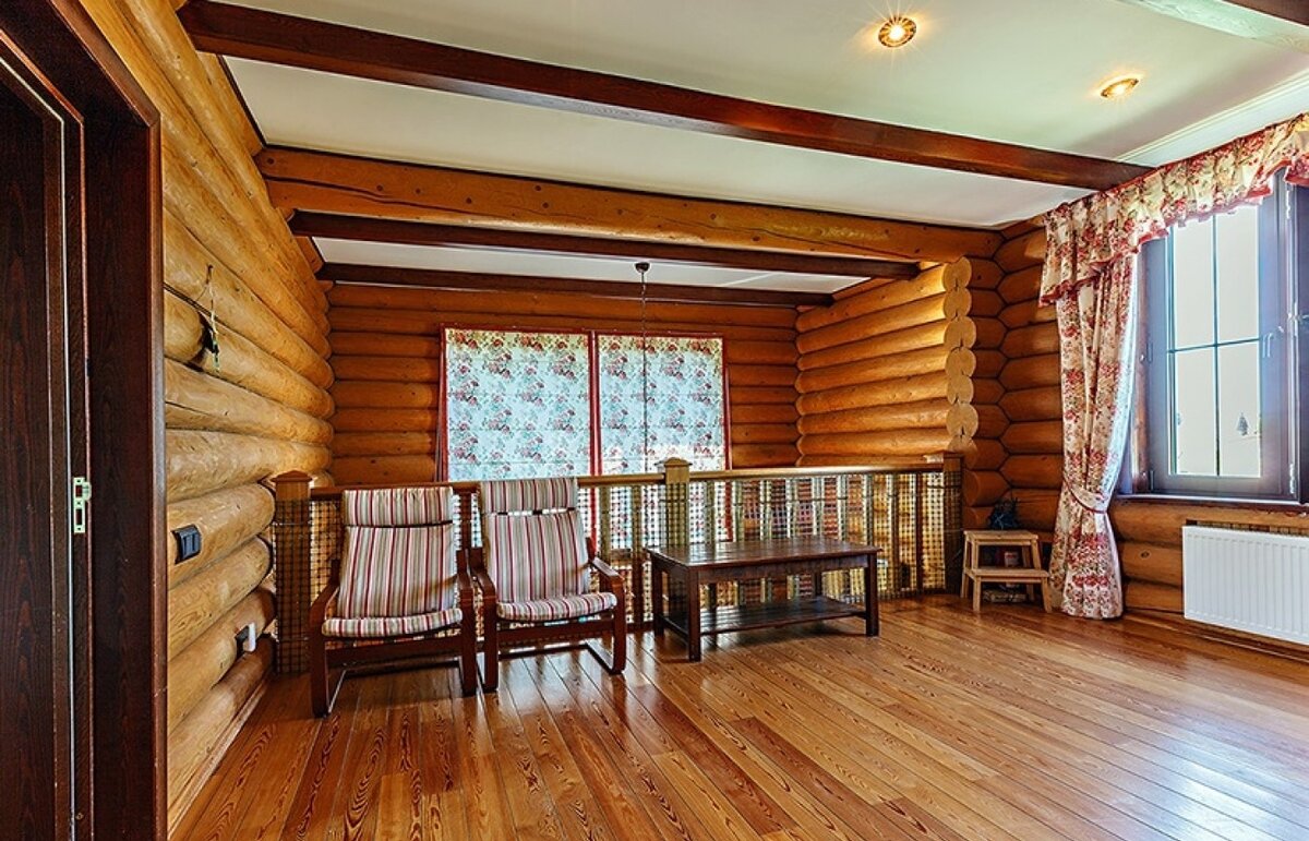 Для этого дерево красят в темные тона, но при этом важно не переборщить, чтобы помещение не получилось слишком темным. А хорошо прорисованную фактуру бревна или бруса позволит получить прокрашивание древесины водной краской. В результате помещение будет немного грубоватым, эксцентричным и неординарным;