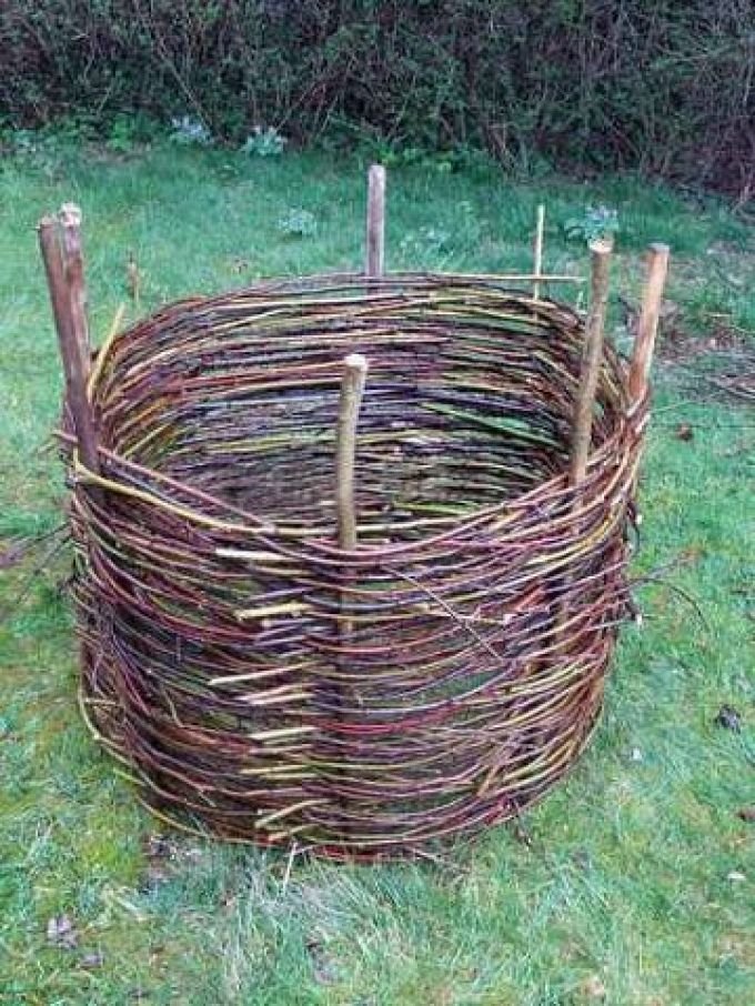 Ветки можно попробовать сплести по методу плетения корзин: комлевая часть (со срезанного конца) ветки фиксируется правой рукой спереди первого кола, а левой рукой ветку заводят за второй кол, позволяя ему выйти перед следующим (третьим) колом. После окончания плетения прутьев первого ряда, приступают ко второму ряду. В этот раз комлевую часть прута фиксируют позади первого кола и спереди огибают второй кол. Далее плетется по схеме.