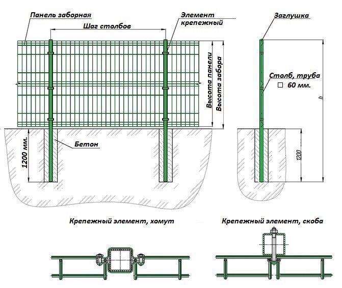 Опоры устанавливаются исходя из высоты изгороди, свойств сетки, диаметра опор.