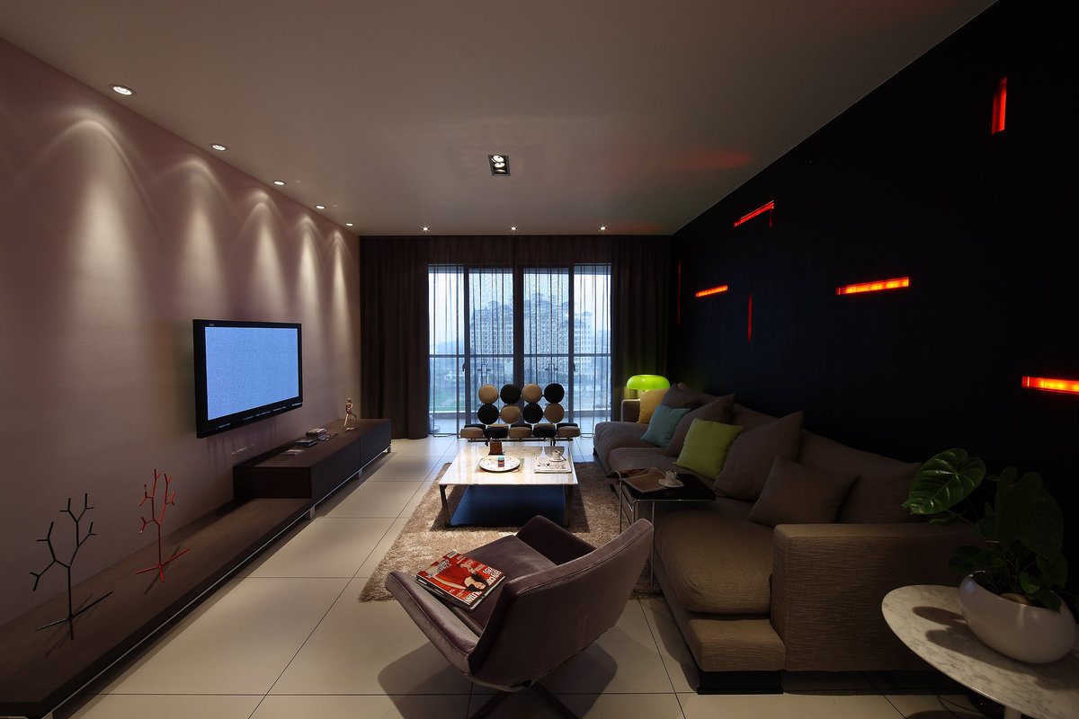 Контрастно и колоритно смотрятся на черном фоне яркие оттенки, такие как зеленый, розовый, оранжевый и фиолетовый. Данные комбинации уместны в гостиных комнатах в качестве акцентных зон, привлекающих общее внимание.
